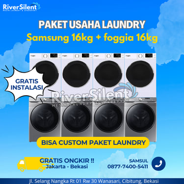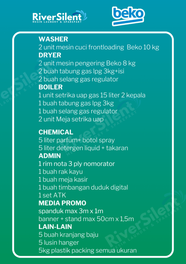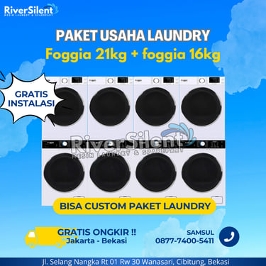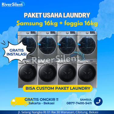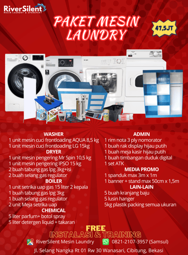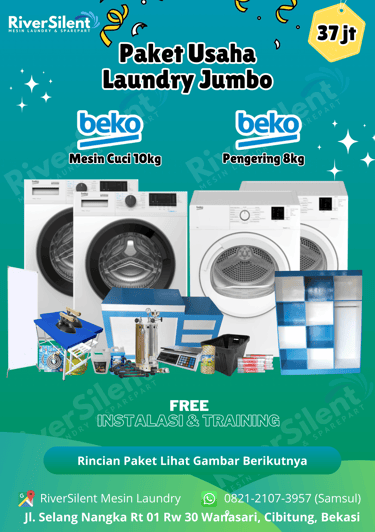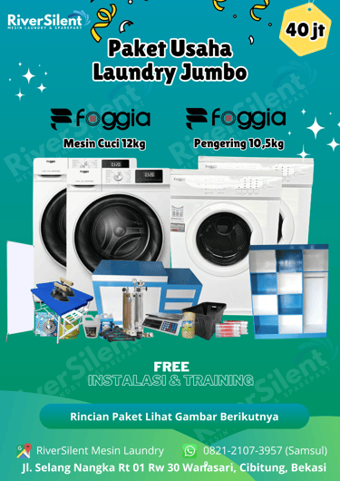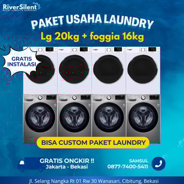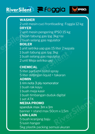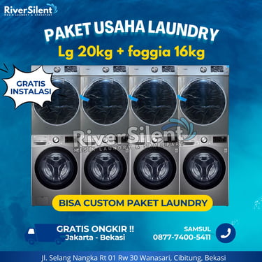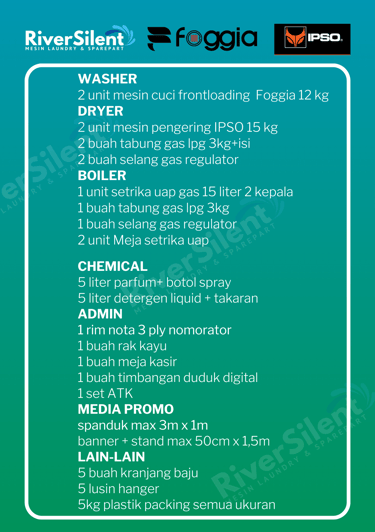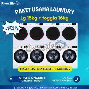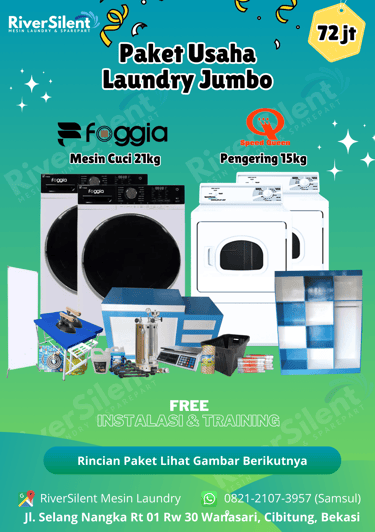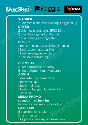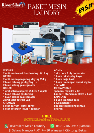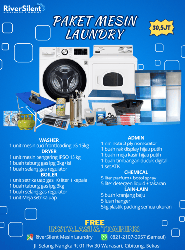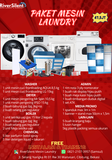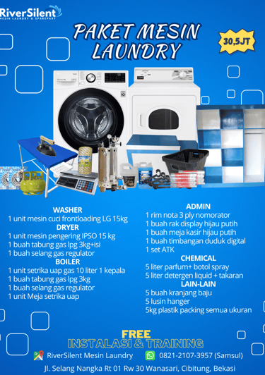 Paket usaha laundry lengkap dengan mesin, perlengkapan, dan bahan baku.